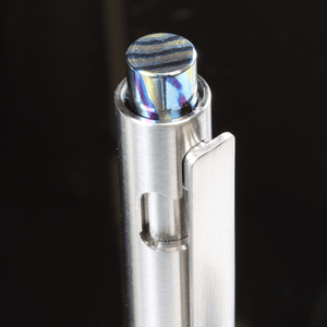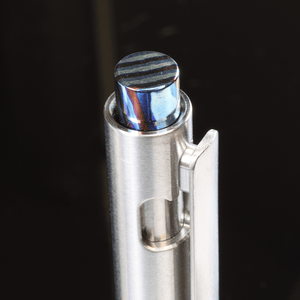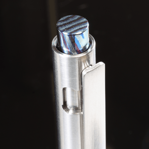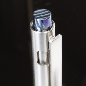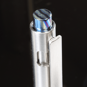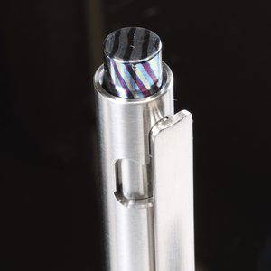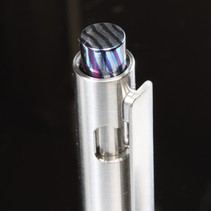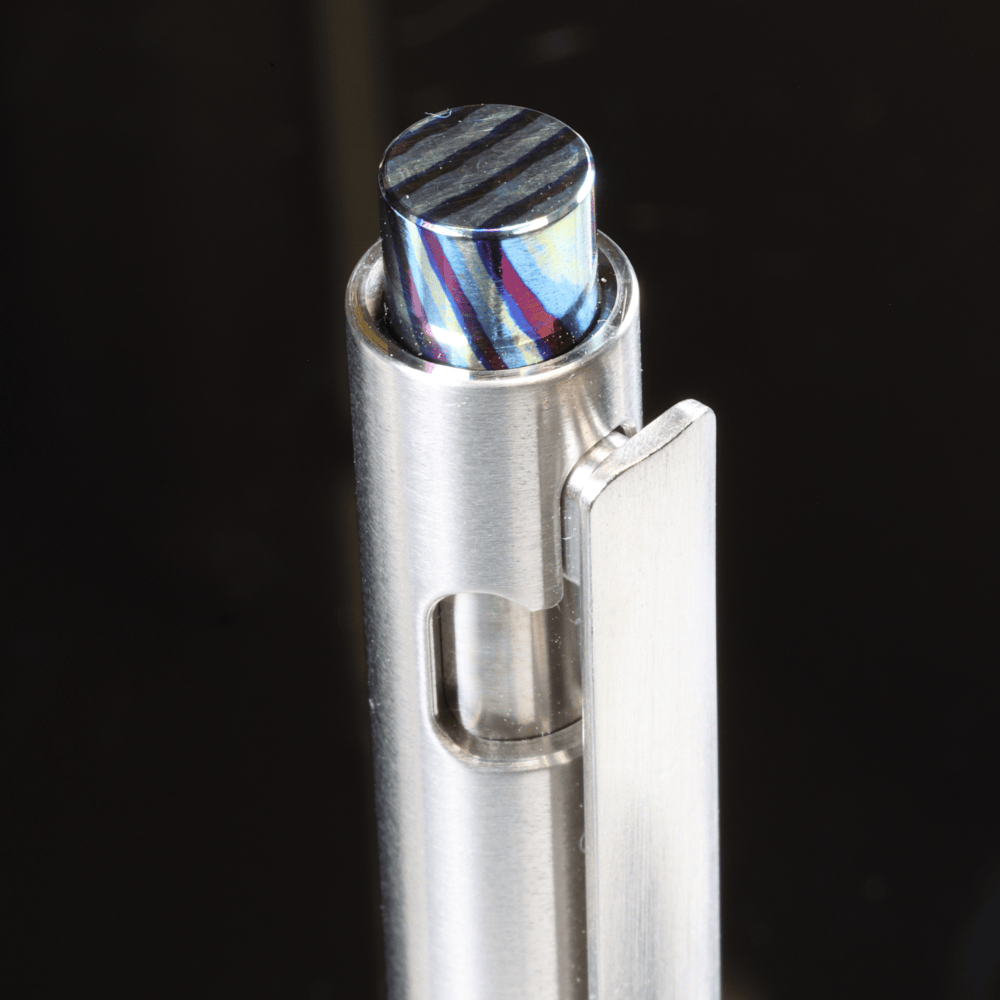 Machined from a solid round bar of titanium, this aBAP features a grooved body for added grip and a titanium clip for everyday versatility. We elevated this edition with a titanium damascus knock. Titanium damascus is created by forging multiple titanium alloys together, resulting in a material that is extremely costly, difficult to machine, and striking in appearance. Each knock is polished and then heat anodized to reveal its vibrant layered colors.